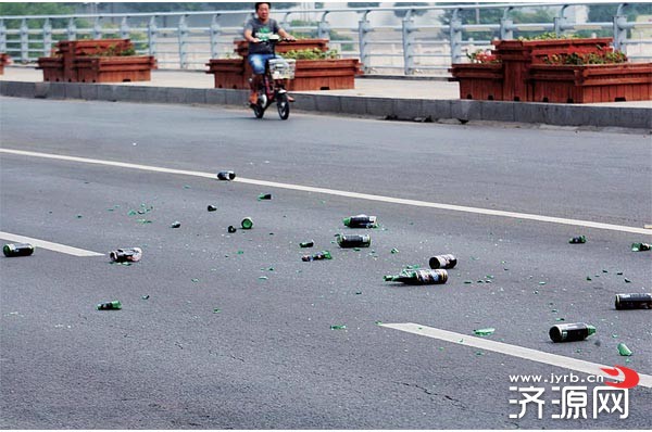 昨天上午10點(diǎn)40分左右,在沁園橋路段的地面上,突然出現(xiàn)了一地破碎的玻璃瓶。當(dāng)時(shí),幾輛從此處經(jīng)過的轎車險(xiǎn)些軋上去。