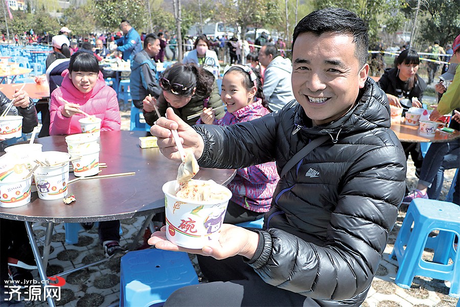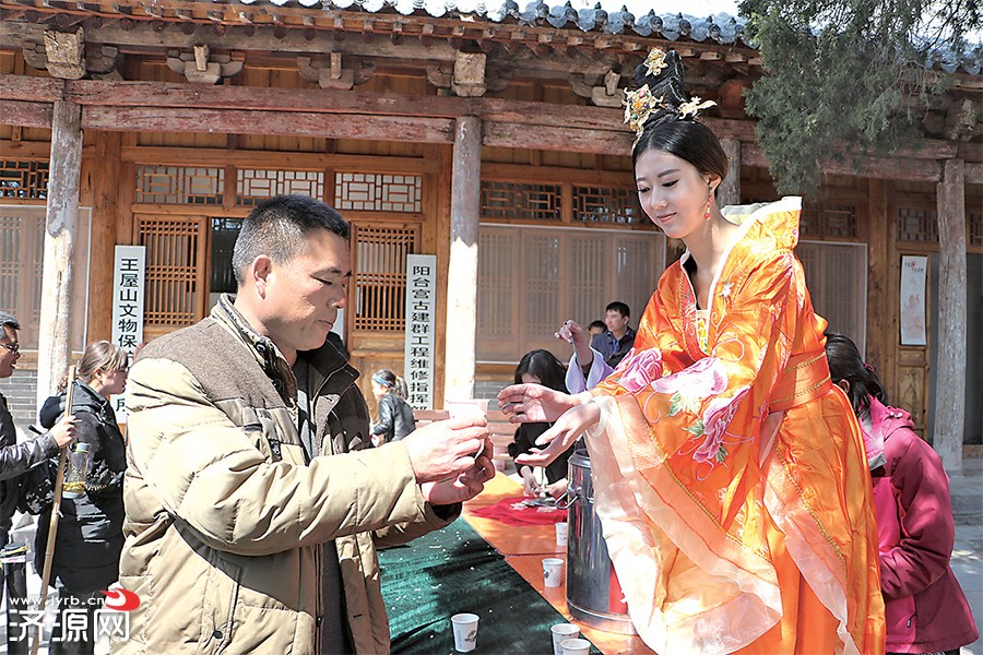 隨后,在“桃花仙子”的帶領(lǐng)下,游客們分別在五行四象廣場(chǎng)、天璣井、醮壇、陽(yáng)臺(tái)宮等地方欣賞并參與了大型創(chuàng)世文化舞蹈、“桃花仙子”灑水賜福、“玉真公主”賜桃花羹、千人餃子宴等環(huán)節(jié)。大型創(chuàng)世文化舞蹈環(huán)節(jié)中的盤古開天、女媧補(bǔ)天和黃帝祭天表演向游客展示了傳承數(shù)千年的王屋山文化;“桃花仙子”為游客們?yōu)⑻飙^井圣水祈福;在陽(yáng)臺(tái)宮,“玉真公主”率領(lǐng)侍女為游客們送上千余份桃花羹和糕點(diǎn);中午,三千名游客共享餃子宴將活動(dòng)推向高潮,場(chǎng)面壯觀。