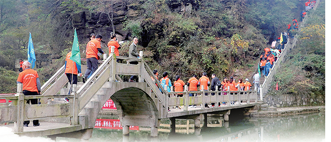 “遙知兄弟登高處,遍插茱萸少一人?!敝仃柟?jié)有登高的習俗?!拔义憻捨医】滴铱鞓肺倚腋?”10月28日上午,思禮鎮(zhèn)九里溝風景區(qū)茱萸峰山道上,傳來一陣陣鏗鏘有力的吶喊聲,一群身著橘黃色T恤的老年人喊著口號朝山頂走去。他們周圍,同樣身著橘黃色T恤的游客或停下來拍照、或三兩結伴嬉笑著向前,秋日里的茱萸峰一片歡騰。由思禮鎮(zhèn)政府、市體育局、市文明辦、市旅發(fā)委、團市委主辦的2017年濟源市思禮鎮(zhèn)“盧仝杯”全民健身登山活動在九里溝風景區(qū)茱萸峰舉行。本次活動以“九九重陽節(jié)·相約茱萸峰”為主題,吸引了2000多名登山愛好者參與。