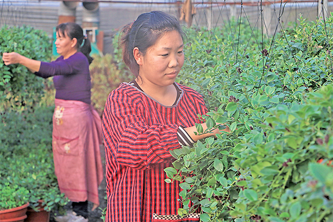 冬季是大棚花卉的移栽、種植、管理的好時機,工人加緊進行花卉生產管理,以供應冬季及來年春季的市場。(李浩 趙新迪 攝)