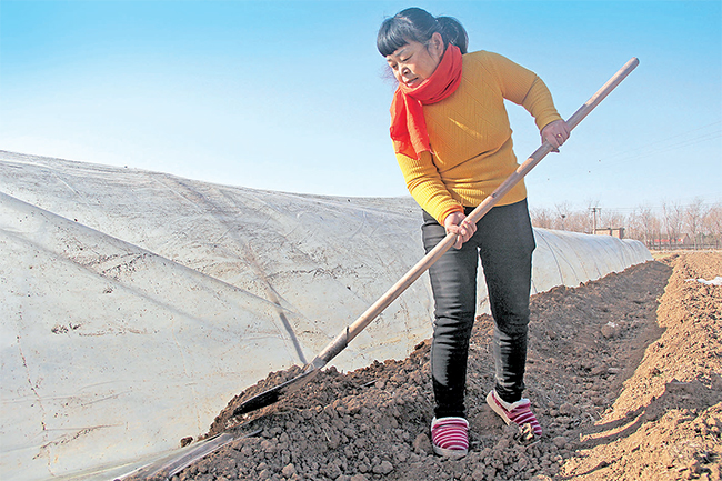 農(nóng)民為塑料薄膜拱棚壓土 確保農(nóng)作物安全過冬