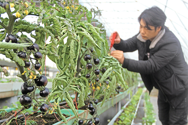 12月28日,沁園街道趙禮莊居委會(huì)菜農(nóng)在為黑番茄點(diǎn)花、打杈。