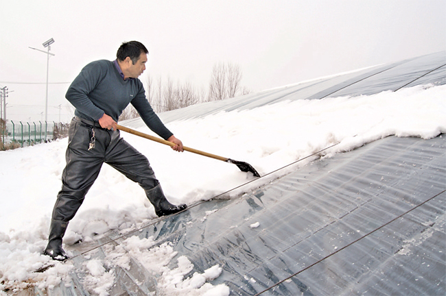 1月7日,村民在清理大棚上的積雪。大雪過(guò)后,為了防止積雪壓塌鮮桃大棚,思禮鎮(zhèn)澗北村匯心農(nóng)業(yè)合作社及時(shí)組織人員對(duì)大棚上的積雪進(jìn)行清理。(記者 王鴻斐 攝)
