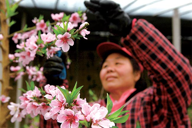 3月6日,在思禮鎮(zhèn)澗北村,工人在管理大棚桃樹。