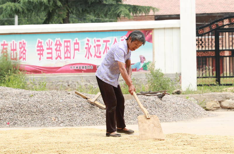 一位村民在翻曬麥子。