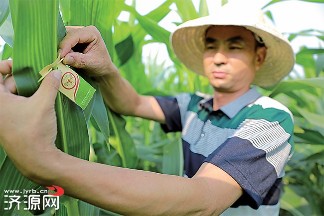 7月24日,在軹城鎮(zhèn)趙村,農民在玉米地投放赤眼蜂卵卡。