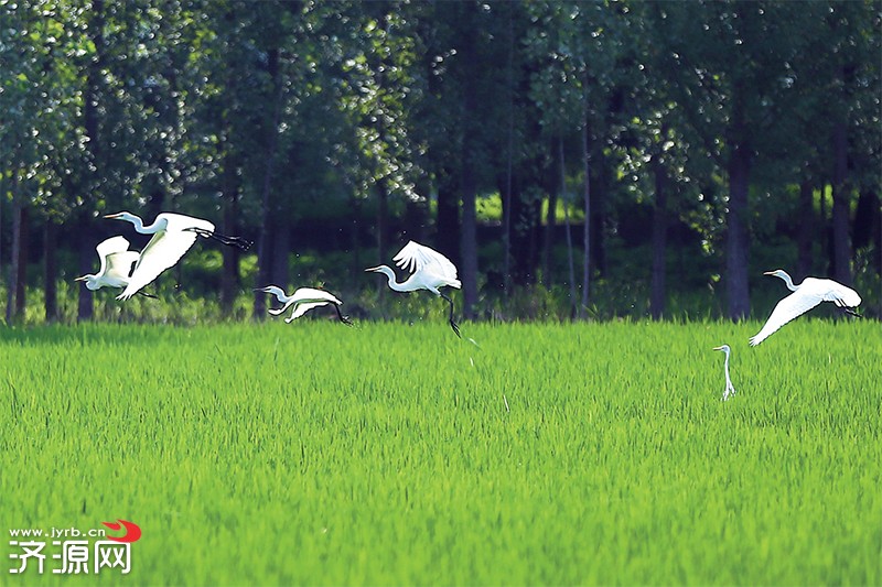 成群結(jié)隊(duì)的白鷺在西正村稻田里嬉戲。 本報(bào)記者 李浩 攝