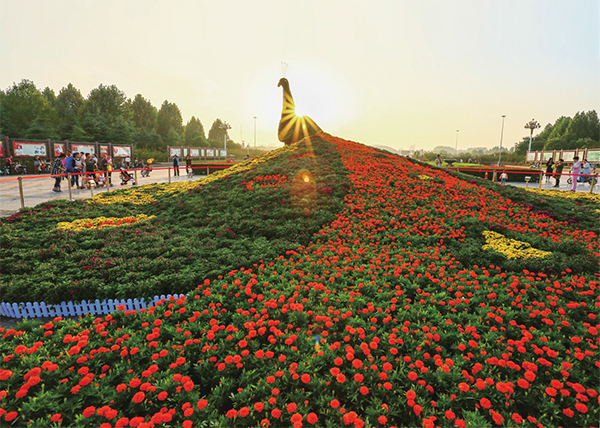 濟(jì)源晨報(bào)記者了解到,從2015年開(kāi)始,我市每年都會(huì)圍繞當(dāng)年社會(huì)發(fā)展的新特點(diǎn)進(jìn)行設(shè)計(jì)布置主題大型花壇供人們觀賞,其中最令人矚目的當(dāng)數(shù)世紀(jì)廣場(chǎng)東入口的主題花壇。國(guó)慶主題花壇憑借鮮艷繽紛的色彩、新穎獨(dú)特的設(shè)計(jì)、祥和美好的寓意,成為每年國(guó)慶期間世紀(jì)廣場(chǎng)上一道亮麗的風(fēng)景,吸引大批市民和全國(guó)各地游客到此合影留念。 2015年9月28日,首個(gè)主體花壇亮相世紀(jì)廣場(chǎng),這一年的主體花壇的主題為“祖國(guó)萬(wàn)歲”。該花壇長(zhǎng)18 米,高8.5 米,寬4米,由5萬(wàn)余株國(guó)慶菊、串串紅、雞冠花、綠草組成大型船只和五星紅旗,寓意著祖國(guó)繁榮昌盛,乘風(fēng)破浪,帶領(lǐng)人民實(shí)現(xiàn)中國(guó)夢(mèng)。 2016年9月28日,國(guó)慶主體花壇如期與市民相約在世紀(jì)廣場(chǎng)。這一年的主體花壇主題為“愚公移山,敢為人先”, 所擺放的鮮花品種包括串串紅、矮牽牛、孔雀草、國(guó)慶菊、雞冠花、彩葉草、綠草、觀賞草等,有紅、黃、綠、紫、粉等顏色,目的是激勵(lì)全市人民弘揚(yáng)愚公移山精神,為實(shí)現(xiàn)“十三五”目標(biāo)而努力奮斗。 2017年的主體花壇的主題為“花團(tuán)錦簇、歡度國(guó)慶、喜迎十九大”,該孔雀造型的鮮花身高7米,全身由綠色的五色草構(gòu)成,孔雀屏由紫紅色和黃色的國(guó)慶菊組成,整個(gè)孔雀直徑有16米?;▔黝}圍繞“新、亮、奇”做造景,以串串紅、國(guó)慶菊、孔雀草、雞冠花等鮮花的顏色為主色調(diào),點(diǎn)綴花柱、花團(tuán)、異形菊等小品,為五彩繽紛的花壇平添了幾分躍動(dòng)的旋律。