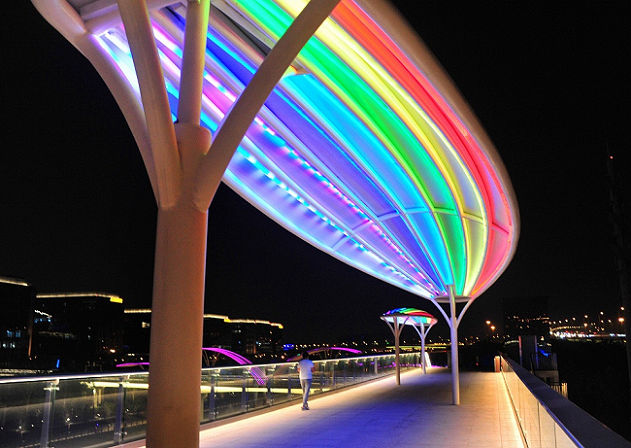 進(jìn)博會期間,如何確保海內(nèi)外賓客快速有序地抵達(dá)主場館?如何讓市民觀展更加便利?交通保障無疑是重中之重。連接虹橋商務(wù)區(qū)核心區(qū)與國家會展中心的二層步廊竣工,從虹橋交通樞紐步行至場館的時(shí)間由1個多小時(shí)縮短至20分鐘。入夜,主題為“七彩聚虹、夢想筑橋”的步廊燈光秀簡潔、大氣、典雅、亮麗,營造出夢幻世界。