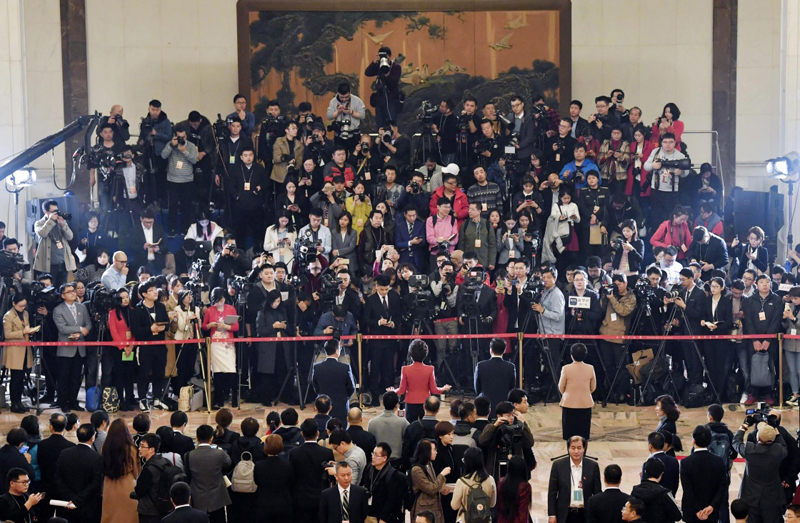 3月3日,中國人民政治協(xié)商會議第十三屆全國委員會第二次會議在北京人民大會堂開幕。這是全國政協(xié)委員施一公、宋紀蓉、潘碧靈(從右至左)在“委員通道”接受采訪。