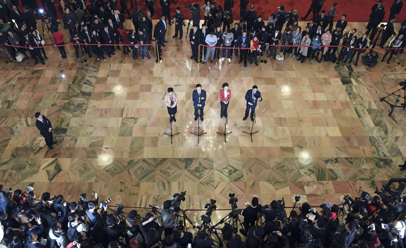 3月3日,中國人民政治協(xié)商會議第十三屆全國委員會第二次會議在北京人民大會堂開幕。這是全國政協(xié)委員王寧利、海霞、張云勇、余留芬(從右至左)在“委員通道”接受采訪。