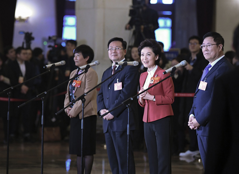 3月3日,中國人民政治協(xié)商會議第十三屆全國委員會第二次會議在北京人民大會堂開幕。這是全國政協(xié)委員吳偉仁(右一)、陳馮富珍(右二)在“委員通道”接受采訪。