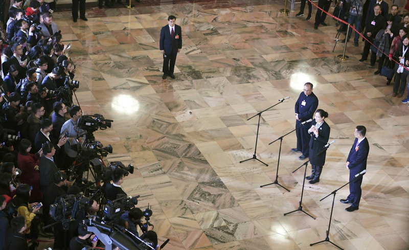 3月3日,中國人民政治協(xié)商會議第十三屆全國委員會第二次會議在北京人民大會堂開幕。這是全國政協(xié)委員施一公、宋紀(jì)蓉、潘碧靈(從右至左)在“委員通道”接受采訪。