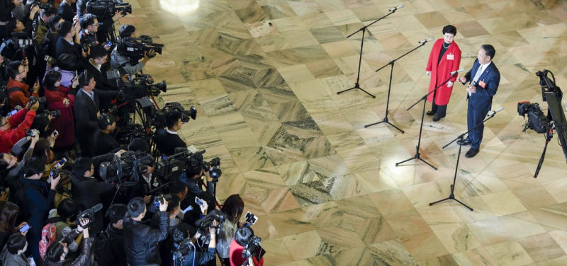 3月3日,中國人民政治協(xié)商會議第十三屆全國委員會第二次會議在北京人民大會堂開幕。這是全國政協(xié)委員吳偉仁(右一)、陳馮富珍(右二)在“委員通道”接受采訪。