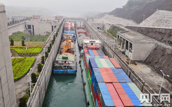 大型船舶經(jīng)過三峽大壩五級(jí)閘口。(央廣網(wǎng)記者 陳銳海 攝)