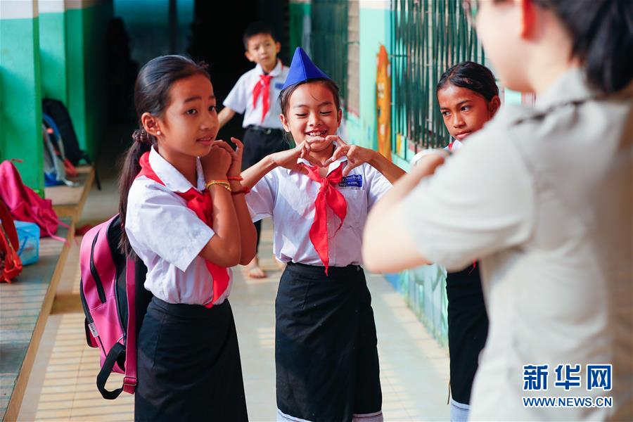 2019年3月25日,在老撾萬象中老農(nóng)冰村小學,漢語教師志愿者姚昌華教學生如何用手比出愛心。由中國和平發(fā)展基金會援建的農(nóng)冰村小學2013年5月竣工。 新華社記者王婧嬙攝