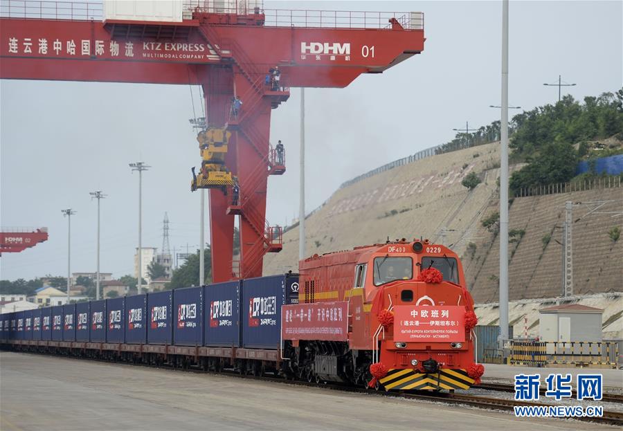 2017年6月8日,由江蘇連云港開往土耳其伊斯坦布爾的中歐班列駛出中哈連云港物流合作基地。 新華社記者季春鵬攝