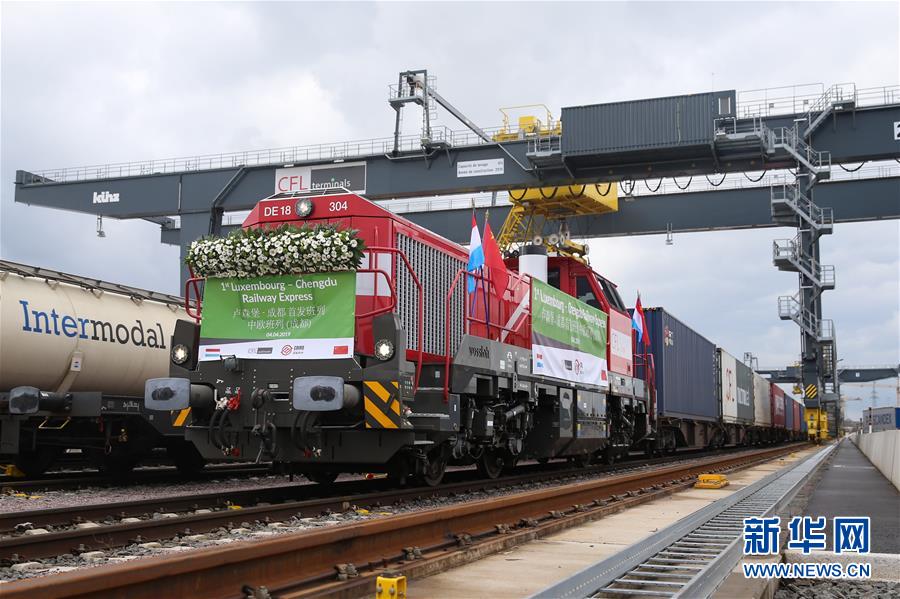 2019年4月4日,首趟盧森堡至成都中歐班列在盧森堡迪德朗日鐵路場站準備出發(fā)。新華社記者鄭煥松攝