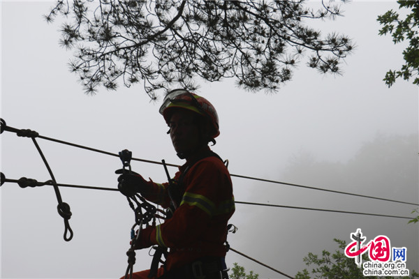 消防員準(zhǔn)備繩索救助系統(tǒng)。中國(guó)網(wǎng)記者 彭瑤 攝