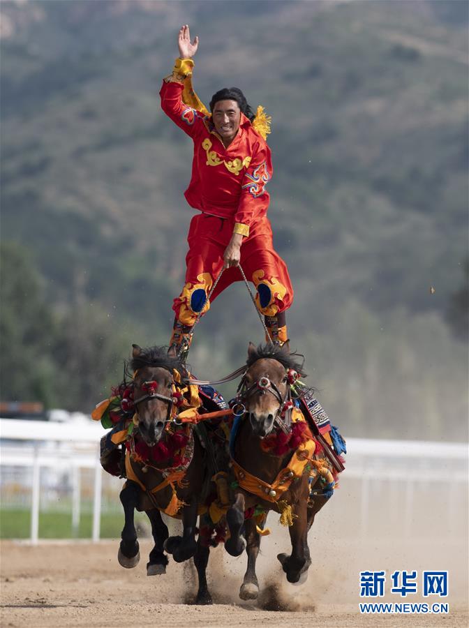 7月15日,青海代表團選手表演馬上技巧。 當日,在內蒙古呼和浩特市舉辦的第十一屆全國少數(shù)民族傳統(tǒng)體育運動會馬上項目進入第四個比賽日。 新華社記者沙達提攝