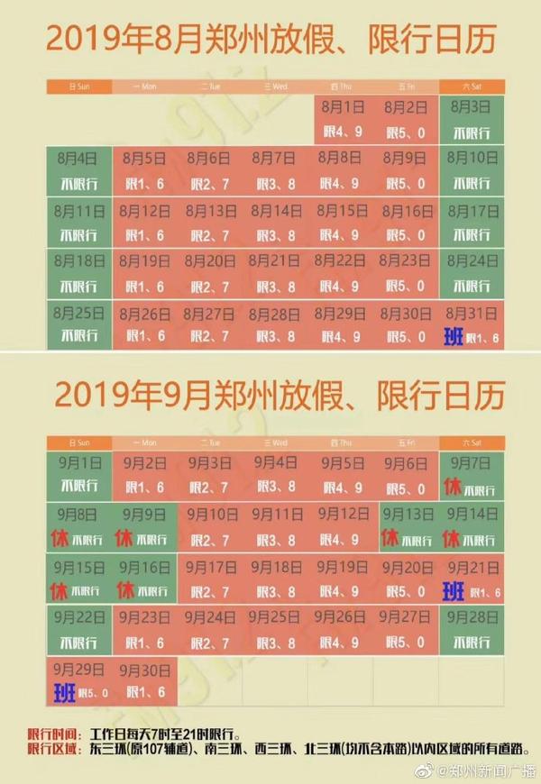 8月27日,河南省人民政府辦公廳發(fā)布通告,第十一屆全國(guó)少數(shù)民族傳統(tǒng)體育運(yùn)動(dòng)會(huì)期間,鄭州市部分區(qū)域調(diào)休。根據(jù)調(diào)休時(shí)間,最新的限行日歷為您奉上,請(qǐng)您接收!(記者 郭兵)