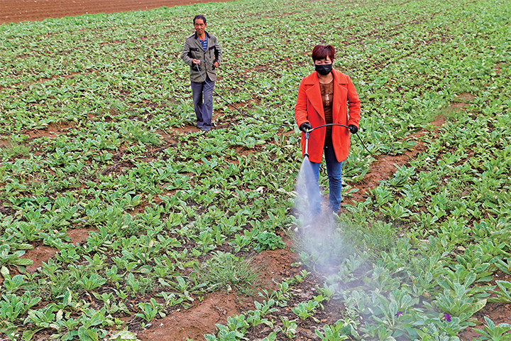 10月10日,在軹城鎮(zhèn)綺里村,農(nóng)民對(duì)田地里的經(jīng)濟(jì)作物噴藥。