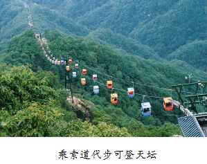 它們既是小型景點(diǎn)建筑,也是人們登山途中休息和觀賞山景的駐足地。20世紀(jì)90年代,為方便游客登天壇山,景區(qū)投資修建了天壇山索道。索道全長(zhǎng)1500米,爬升高度為660米,原來(lái)沿瘦龍嶺登上天壇山頂需近3個(gè)小時(shí),改乘索道后僅需10分鐘可到達(dá)日精峰頂,再徒步半小時(shí)可登臨天壇山頂。