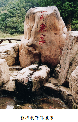 在千年銀杏樹(shù)下,有一脈泉水穿石而出,涓涓細(xì)流長(zhǎng)年不涸,且水質(zhì)清冽甘甜,被人尊稱(chēng)為“不老泉”。據(jù)測(cè)定,不老泉水富含鉀、鋰、鈷、鐵、錳等多種礦物質(zhì)和稀有元素,礦化度1 0 00毫克/升,是天然優(yōu)質(zhì)礦泉水。它與千年銀杏樹(shù)相伴成景,皆有長(zhǎng)生不老之象征。