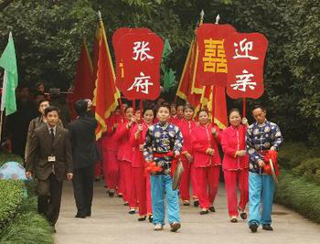 婚禮是完成婚姻大事的最后一道程序。結(jié)婚前一天,男方要派車到女方家拉嫁妝,女方家的小姑子、嫂嫂則要拉箱禮錢,熱熱鬧鬧,一直到下午才放鞭炮返回。