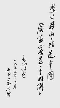 1957年10月9日,一份來自山東莒南縣的關(guān)于農(nóng)業(yè)生產(chǎn)的報告送到了毛澤東主席的辦公桌上,報告的題目是《山東省莒南縣厲家寨大山農(nóng)業(yè)社千方百計爭取豐收再豐收》。毛澤東在這份關(guān)于厲家寨農(nóng)業(yè)豐收的報告上,揮筆寫下了“愚公移山,改造中國,厲家寨是一個好例”的批語。從此,厲家寨名播全國,成為全國農(nóng)業(yè)戰(zhàn)線的先進典型。我們今天看到的毛澤東手書的“愚公移山,改造中國”八個字,就是從當年毛澤東的批語中摘取的。毛澤東的批語,很快成為鼓舞全國人民改造山河的偉大號召。廣大人民群眾以前所未有的熱情,積極發(fā)展生產(chǎn),創(chuàng)造了一個又一個奇跡。20世紀五六十年代,最能體現(xiàn)毛澤東“愚公移山改造中國”巨大號召力的是50年代濟源縣的蟒河綜合治理和60年代林縣(今林州市)紅旗渠建設(shè)工程?! ?/p>