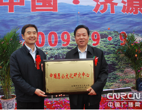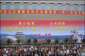 “愚公之鄉(xiāng)”授濟源。濟源是愚公移山寓言故事的源發(fā)地。愚公移山文化不僅有深刻的政治內(nèi)涵,時代價值,也有廣泛的群眾基礎(chǔ),一直以來受到國家、省、市的高度重視和關(guān)注。2009年9月9日,“中國愚公文化之鄉(xiāng)”、“中國愚公文化研究中心”命名授牌儀式在濟源文化城西廣場隆重舉行,中國民協(xié)分黨組書記羅揚,中國民協(xié)分黨組成員、副秘書長趙鐵信,中國民協(xié)分黨組成員、副秘書長呂軍,中國民協(xié)副主席常嗣新,省文聯(lián)黨組書記吳長忠,省文聯(lián)副主席何白鷗,中國民協(xié)副主席夏挽群,省民協(xié)副主席、副秘書長程健君等以及前來參加中國民間文化之鄉(xiāng)暨新農(nóng)村文化建設(shè)縣(市)長論壇的二百余名代表,一起見證了“中國愚公文化之鄉(xiāng)”、 “中國愚公文化研究中心”的命名授牌。至此,又一個國家級文化品牌——“中國愚公文化之鄉(xiāng)”、“中國愚公文化研究中心”花落濟源,使得滿目芳菲的中原文化園圃中再添一枝奇葩。
