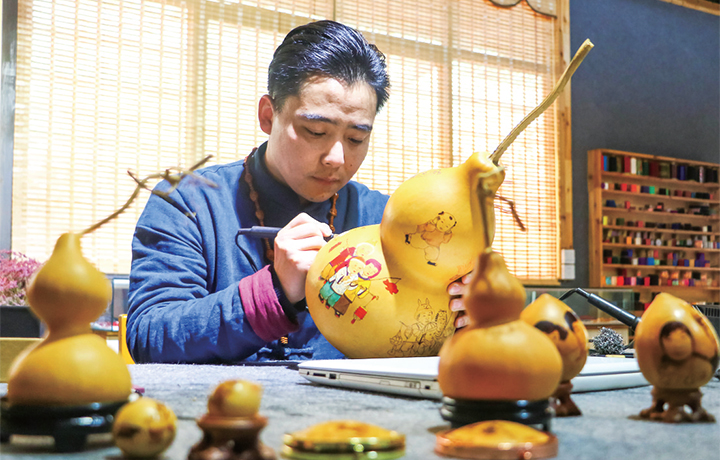 1月13日,葫蘆烙畫藝人正在葫蘆上烙繪圖案。