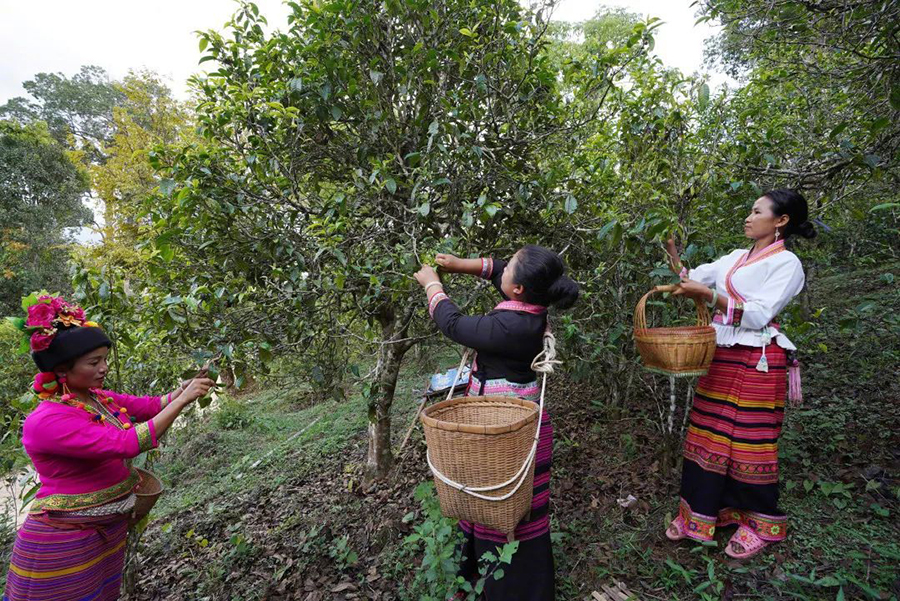 布朗山布朗族鄉(xiāng)老曼峨寨村民在采摘古樹茶。
