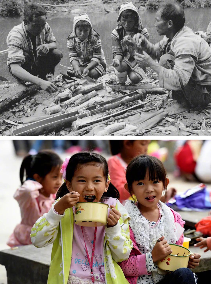 從在河邊吃竹筒飯到學(xué)生的“免費(fèi)午餐”,這兩張照片從飲食角度展現(xiàn)了基諾族生活條件的改善。