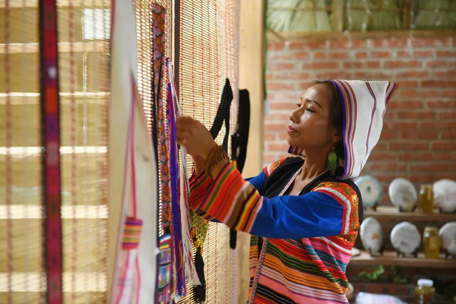 基諾山基諾族鄉(xiāng)巴飄村村民在整理出售的傳統(tǒng)手工織物。