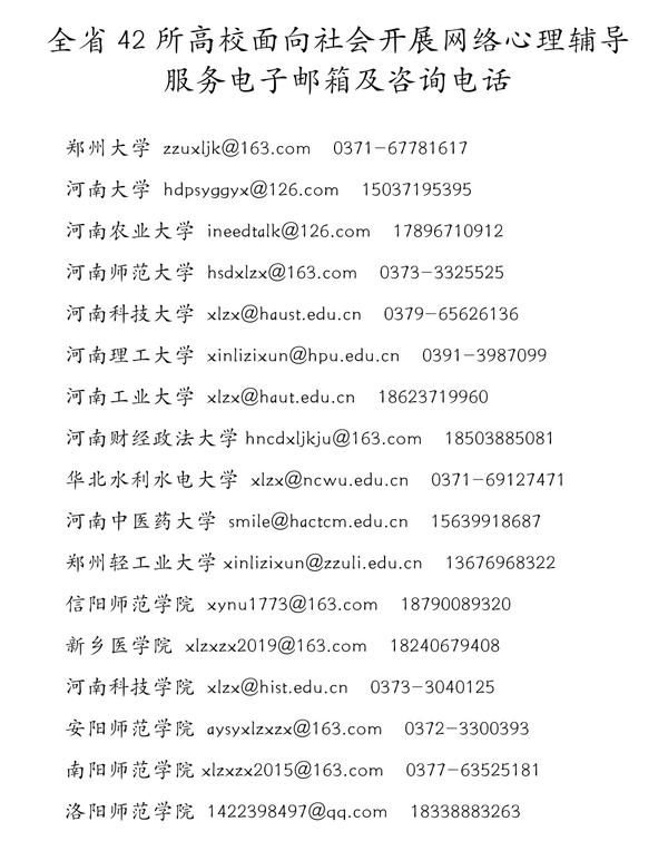 附:全省42所高校面向社會(huì)開(kāi)展網(wǎng)絡(luò)心理輔導(dǎo)服務(wù)電子郵箱及咨詢電話