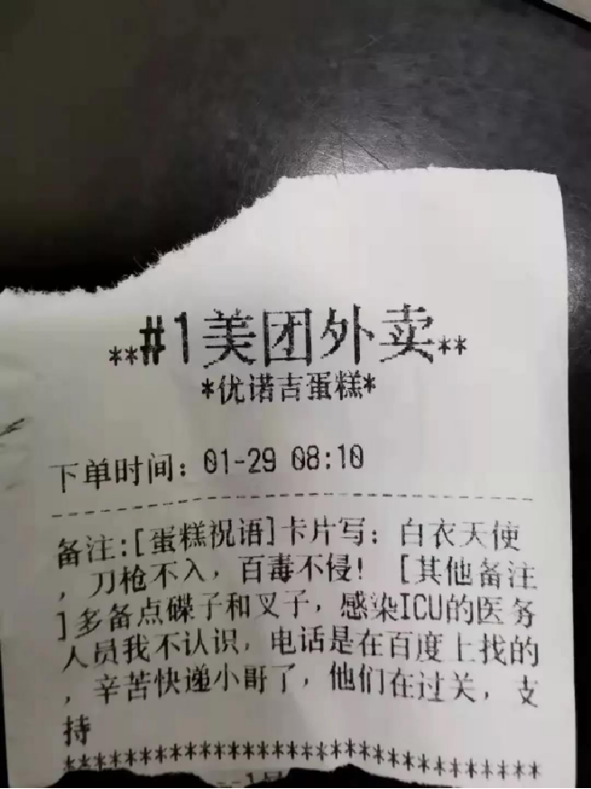 1月29日下午,一份愛心蛋糕外賣被送到了南陽市市中心醫(yī)院。這位點(diǎn)外賣的熱心市民匿名在外賣小票上備注:“祝愿白衣天使,刀槍不入,百毒不侵!多備點(diǎn)碟子和叉子,感染ICU的醫(yī)務(wù)人員我不認(rèn)識(shí),電話是在百度上找的,辛苦快遞小哥了,他們在過關(guān),支持!”
