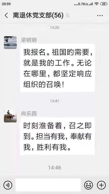 特別值得一提的是,在河南省疾控中心黨委倡議書發(fā)出后,幾十位離退休老黨員,年齡八九十歲,先后到離退休人員工作處或打電話申請(qǐng)要求參戰(zhàn)。首批劉春華、馬曉光、王少華、孫國(guó)清4名入選,其他人時(shí)刻準(zhǔn)備著加入戰(zhàn)“疫”。