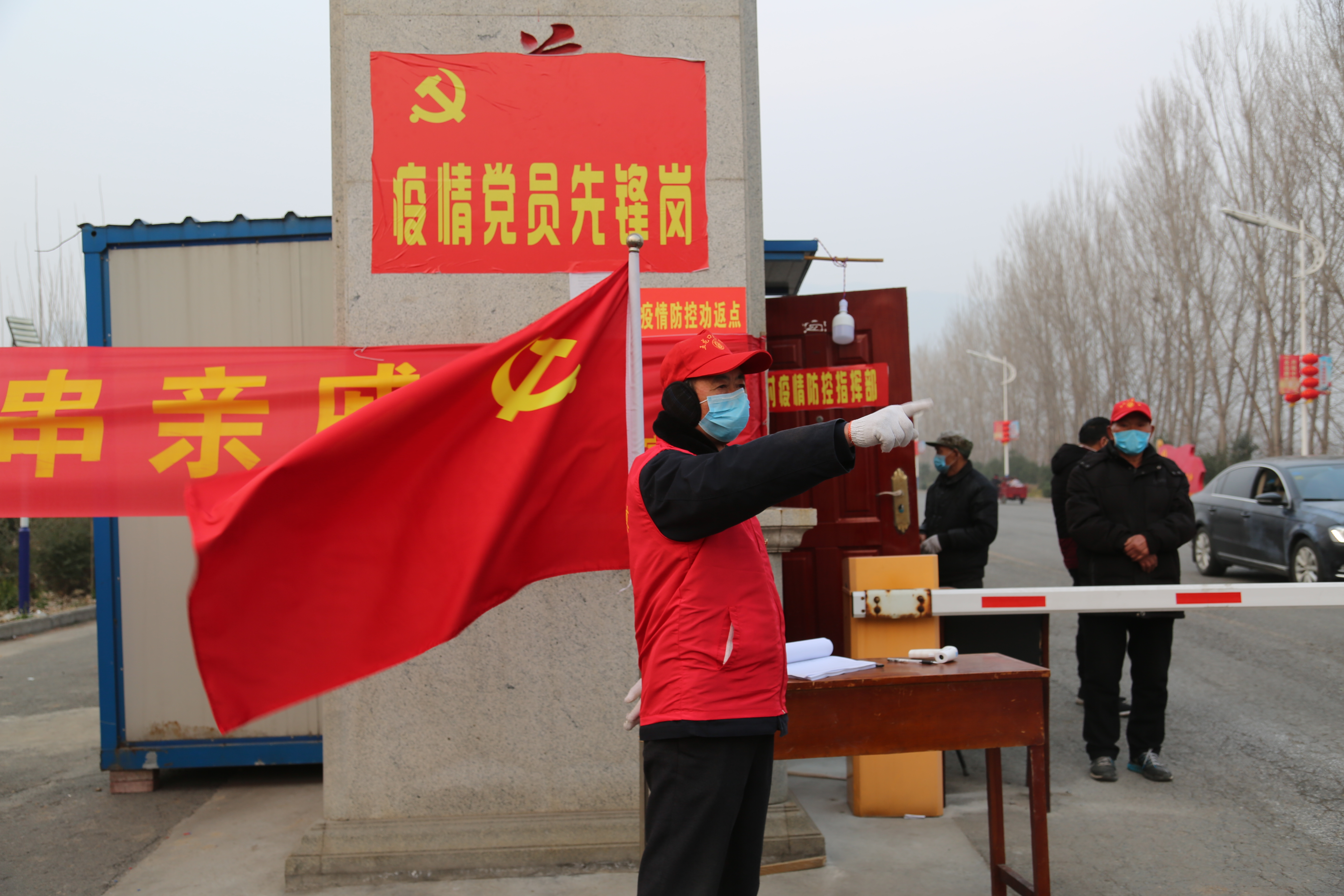 在坡頭鎮(zhèn)柳玉溝村防控檢查站,黨員對(duì)著黨旗宣誓,共防疫情。薛高領(lǐng) 攝