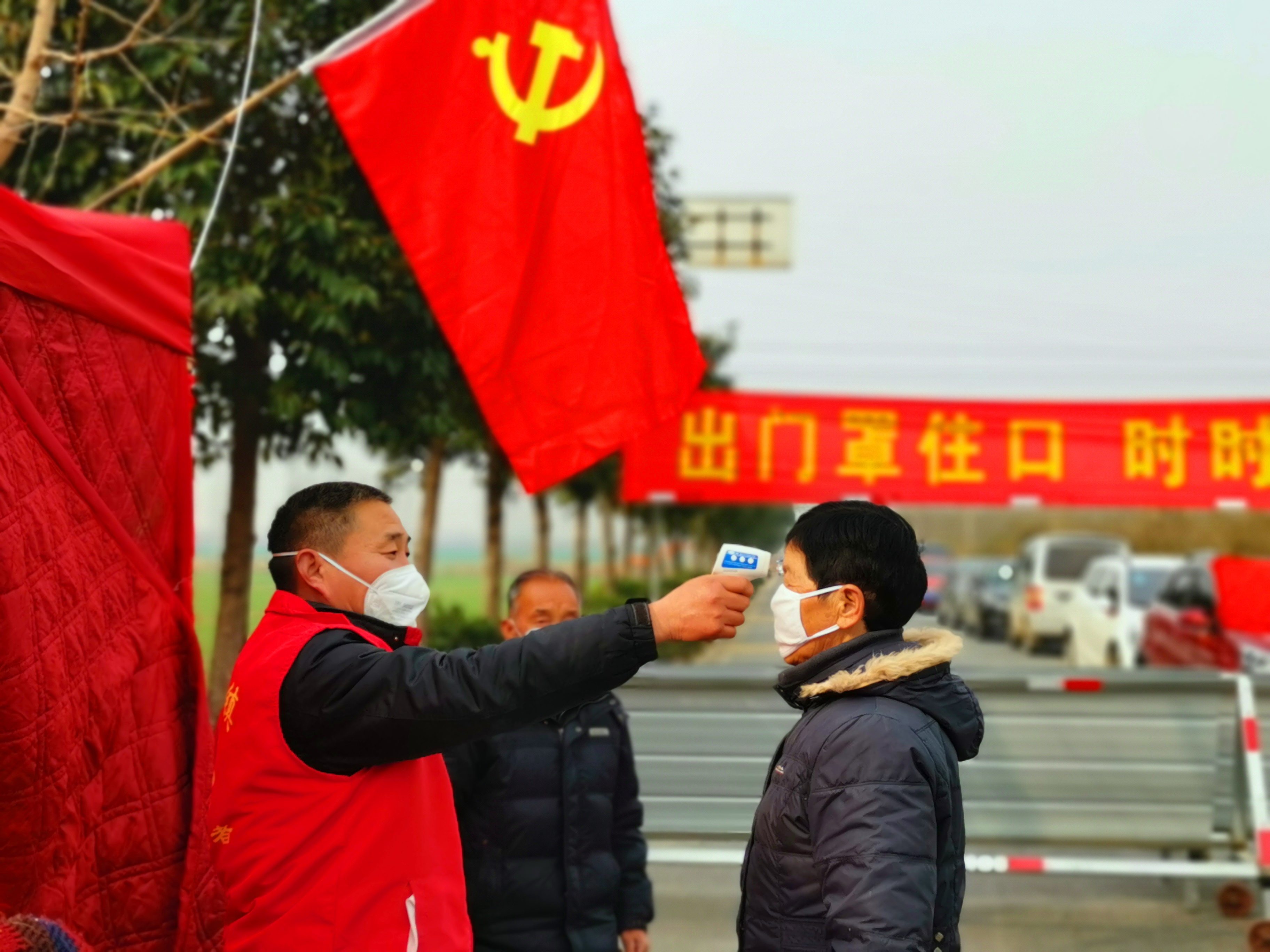 在五龍口鎮(zhèn)古楊樹莊村檢查站,黨員干部積極組織群眾參與防控工作。圖為值守人員正在給過往群眾測(cè)量體溫??桌?攝