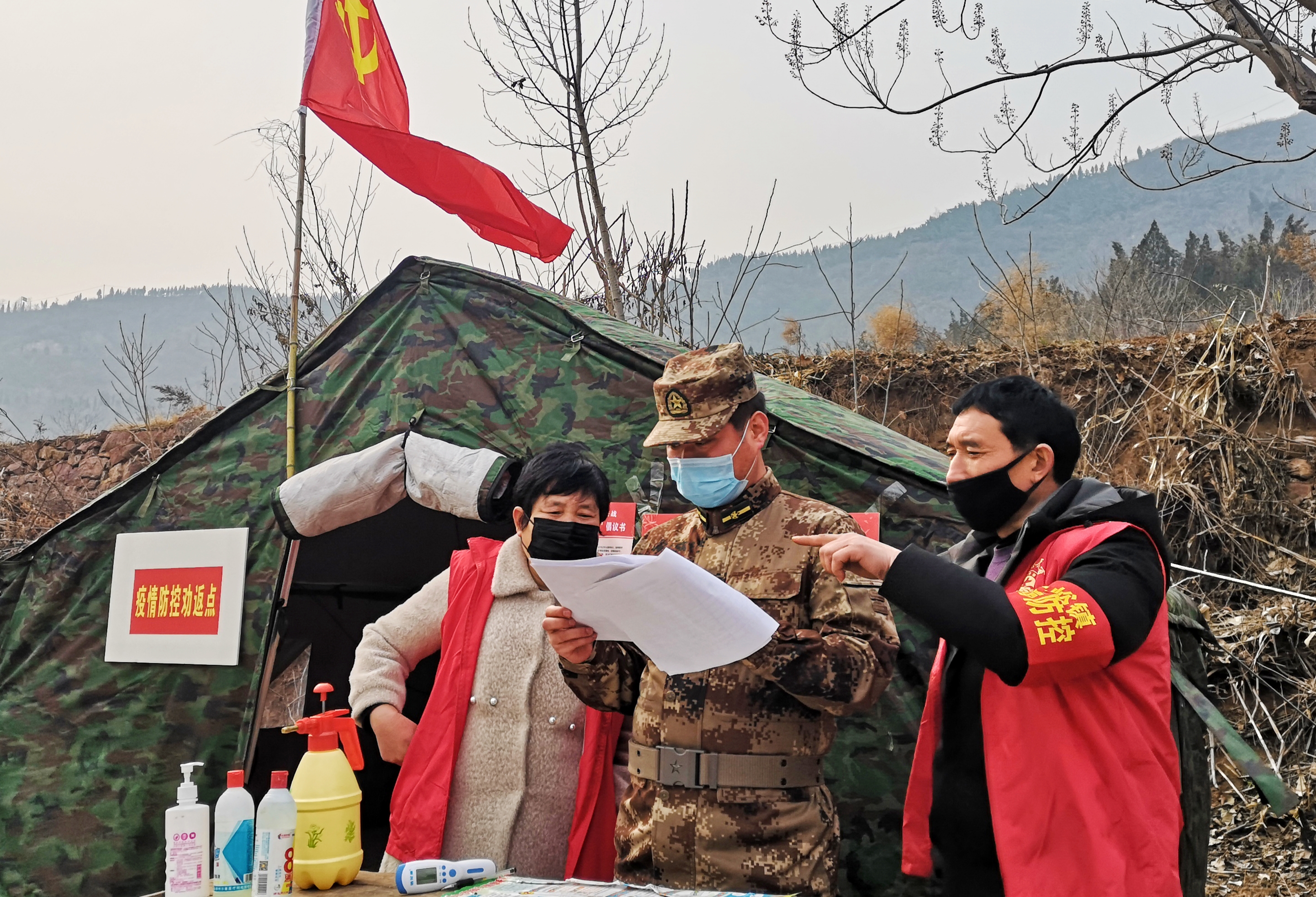 2月1日,大峪鎮(zhèn)民兵賈述文(中)在偏看村指導(dǎo)疫情防控點(diǎn)黨員干部做好值守工作。薛永亮 攝