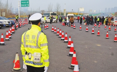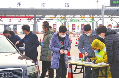 ▲執(zhí)勤交警嚴(yán)格把關(guān) 2月2日,鄭州返程客流上升。在鄭州南站,進(jìn)入市區(qū)的所有車輛和人員都要測體溫、消毒和登記身份信息。河南日報(bào)記者陳更生攝