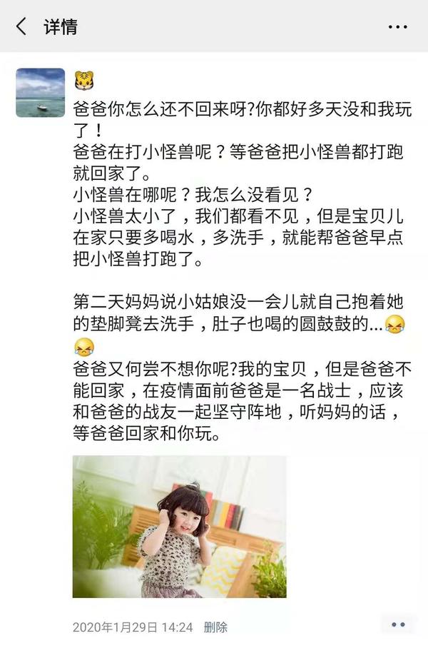 爸爸又何嘗不想你呢?我的寶貝,但是爸爸不能回家。在疫情面前,爸爸是一名戰(zhàn)士,應(yīng)該戰(zhàn)友一起堅(jiān)守陣地,聽(tīng)媽媽的話,等爸爸回家和你玩。