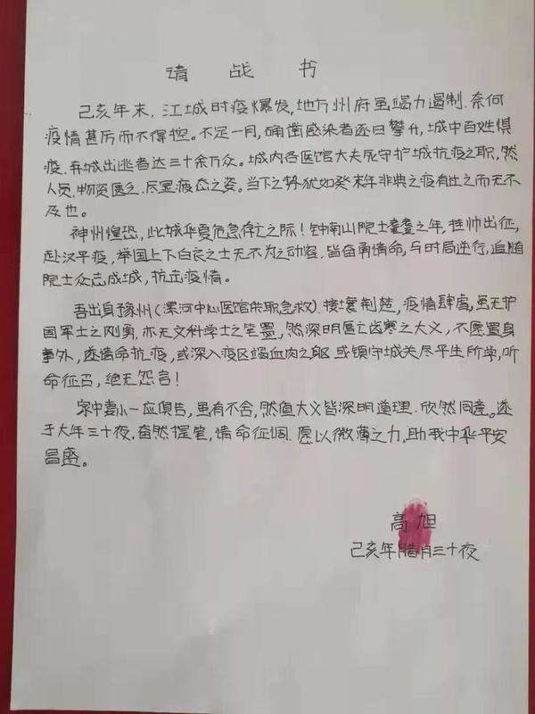 夜班醫(yī)生高旭坐在值班室內(nèi),病房內(nèi)患者已經(jīng)入睡,病房外黑夜寂靜幽深,這讓他想起了除夕書房挑燈偷偷寫請?jiān)笗耐砩?,那時(shí)的他已下定了決心,在紙上寫著“吾出身豫州(漯河市中心醫(yī)院),接壤荊楚,疫情肆虐,雖無護(hù)國軍士之剛勇,亦無文科學(xué)士之筆墨,然深明唇亡齒寒之大義,不愿置身事外,遂請命抗疫,或深入疫區(qū)竭血肉之軀或鎮(zhèn)守城關(guān)盡平生所學(xué),聽命征召,絕無怨言!”