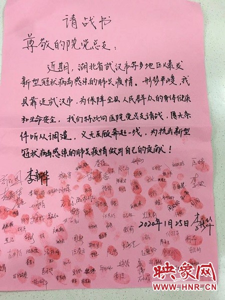 在疫情爆發(fā)的緊要關(guān)頭,李新華在全院發(fā)出請(qǐng)戰(zhàn)書,并第一個(gè)報(bào)名申請(qǐng)到疫情救治一線,帶動(dòng)全院百余名護(hù)理人員鄭重地按下請(qǐng)戰(zhàn)的紅手印。在墻上張貼的護(hù)理一線值班表上,李新華的名字從從除夕一直排到正月十五?! ?/p>