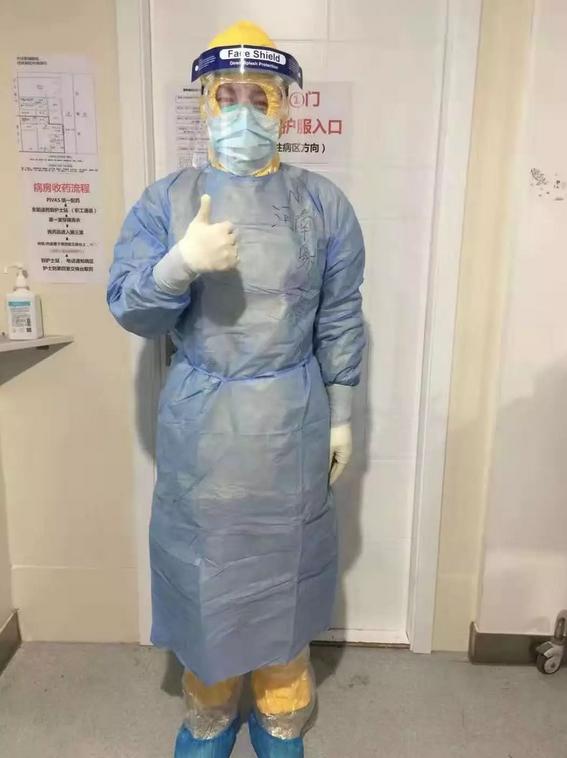 14:20,到達(dá)華中科技大學(xué)同濟(jì)醫(yī)院。直接刷門禁卡走醫(yī)務(wù)人員專用通道,換上洗手衣,然后開始武裝,感控老師很認(rèn)真地把我的頭發(fā)又梳了梳,盤的發(fā)髻不能太高,太高的話帽子會(huì)包不嚴(yán)下面的頭發(fā),太低的話前面的額頭包不住。然后開始從上到下一層一層的穿。