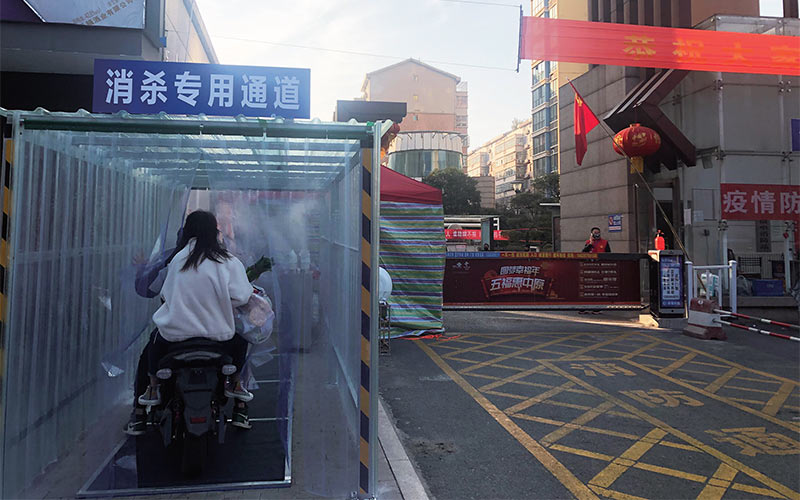 2月10日下午,記者來(lái)到御景尚都小區(qū)。在該小區(qū)東門僅剩的出入口,記者看到一條長(zhǎng)約5米、寬約2米的透明“消殺專用通道”已經(jīng)“上崗”,通道內(nèi)霧氣繚繞,一臺(tái)消毒機(jī)正不斷噴出霧氣。不管是步行或騎電動(dòng)車進(jìn)出的居民,都能接受霧氣消毒。