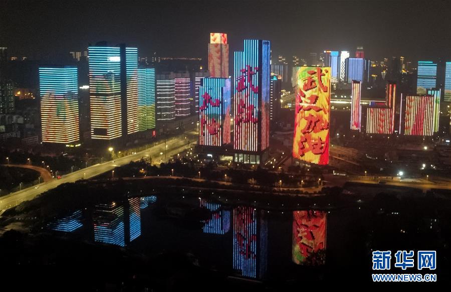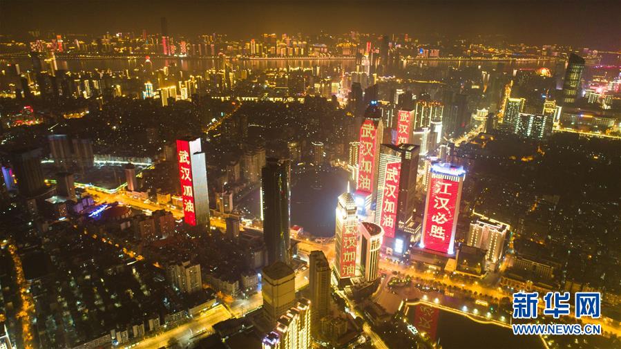 1月31日,武漢市江漢區(qū)西北湖附近高層建筑外墻打出“武漢加油”等字樣(無人機照片)。 新華社記者肖藝九攝