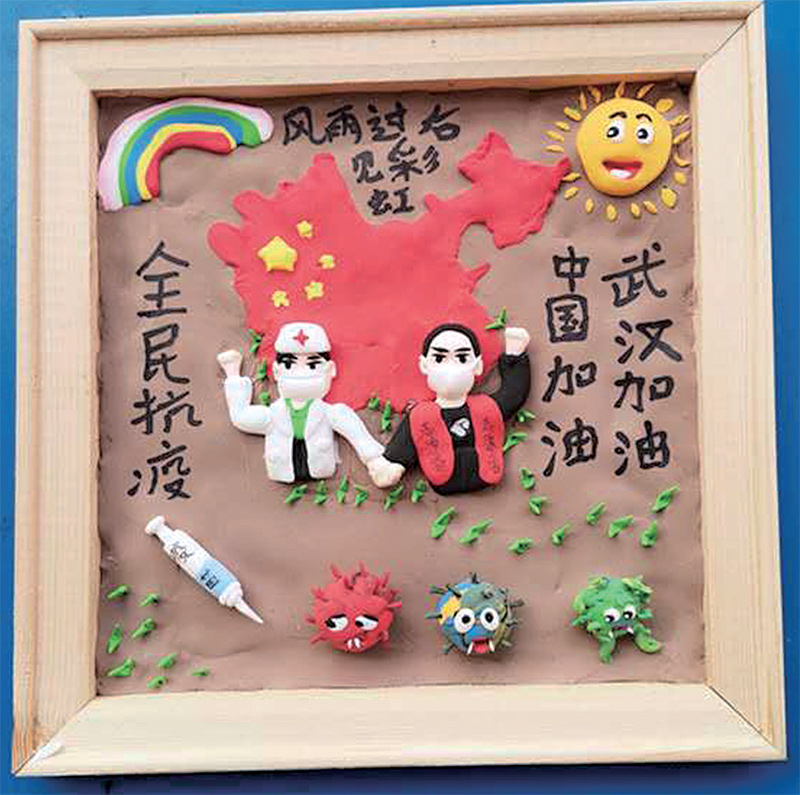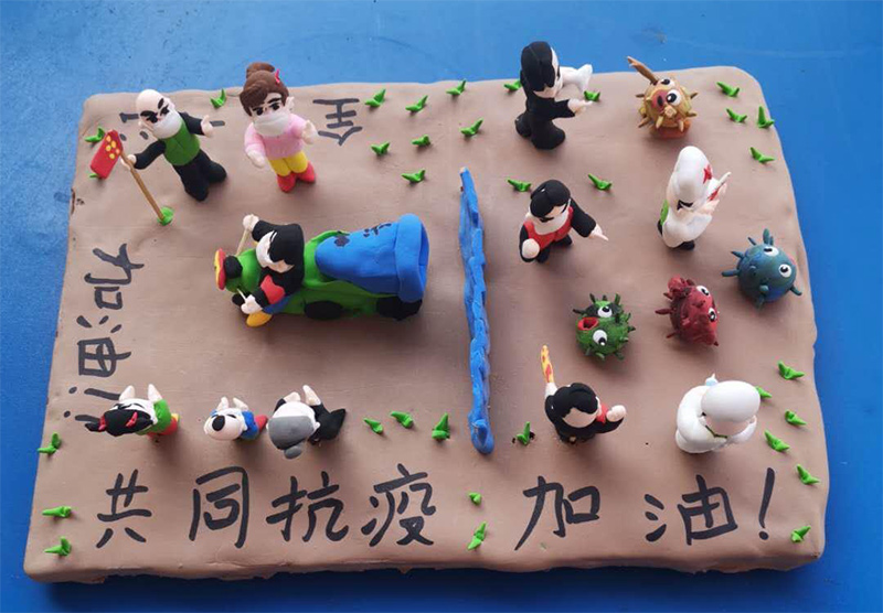 “每一件作品就是一個故事,每一個人物都有自己的靈魂?!敝x文明說,他在創(chuàng)作中專門給卡通人物戴上了口罩,或者重點突出“常洗手”“宅在家”“讀好書”等主題,創(chuàng)作好后將部分作品送給了轄區(qū)的少年兒童,目的是讓孩子們懂得防疫知識,學(xué)會保護自己。