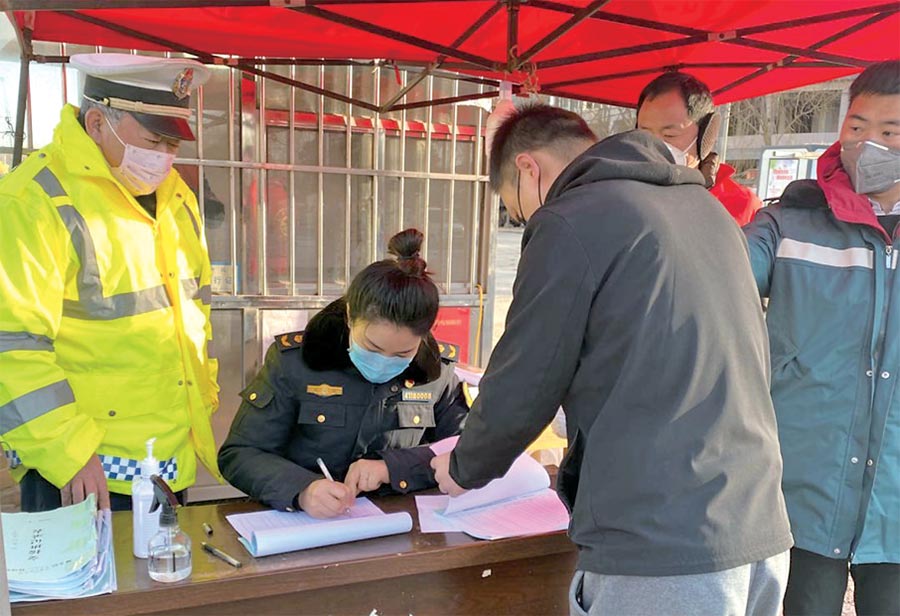 馬淑銀在坡頭與吉利交界處的監(jiān)測(cè)卡點(diǎn)幫助登記過往車輛、人員信息。 圖由交通運(yùn)輸執(zhí)法支隊(duì)提供